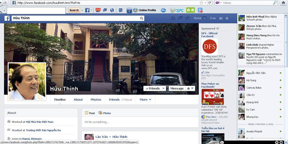 Nhà thơ Trần Nhương khẳng định mình được được nhà văn Nguyễn Hiếu thông báo bác Hữu Thỉnh có facebook rồi. Thú thật là bất ngờ quá vì chủ tịch hội mà chơi được mạng xã hội là cực kì hay, đúng là ban chấp hành điện tử như hồi nào đã tuyên bố vậy.